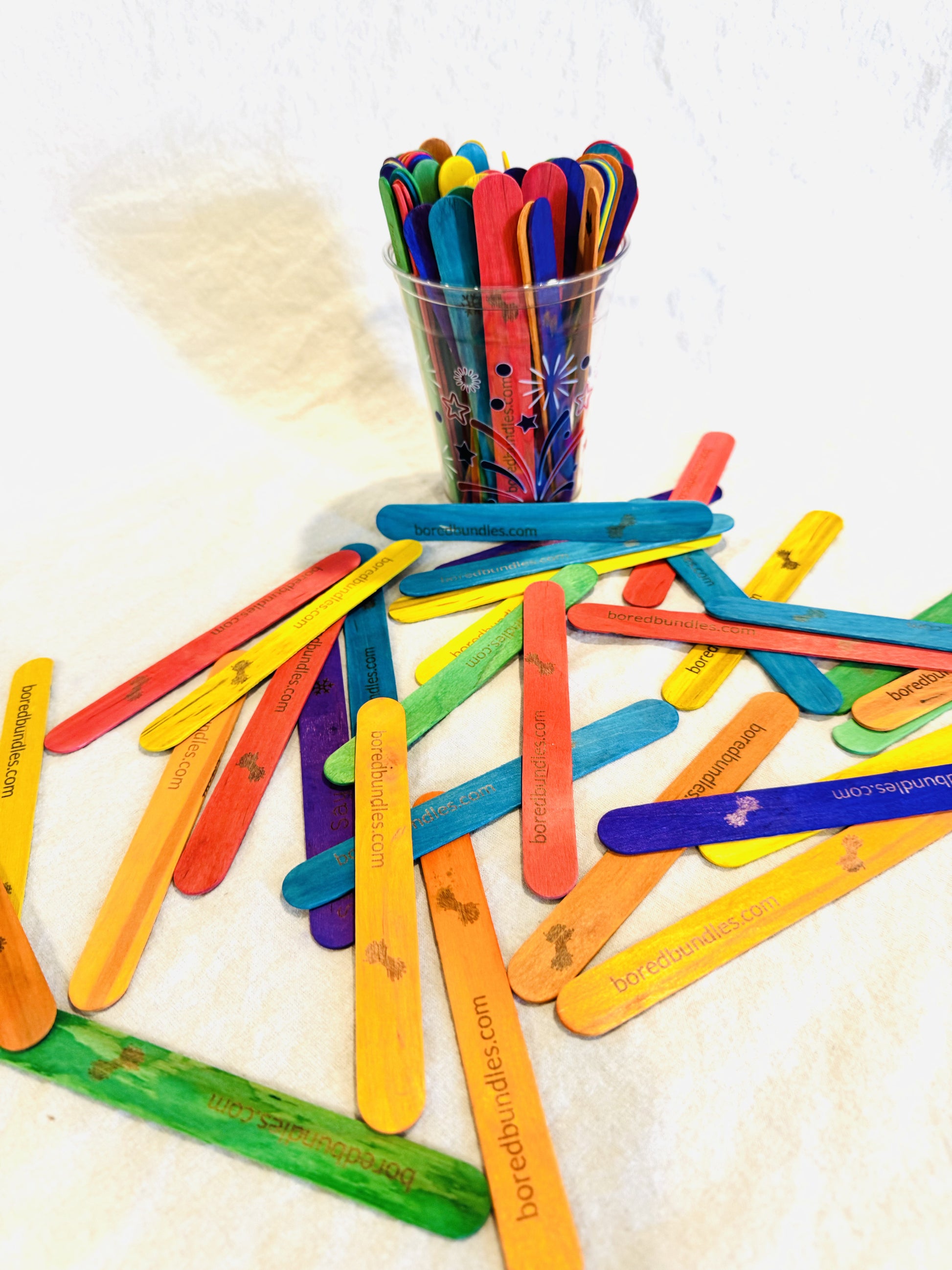 Place your bundles in a mason jar for easy access. Anytime you hear "I'm bored!" have them draw a stick at random and read the activity listed. The rule in our house is once it's picked you have to try it, no second draws!